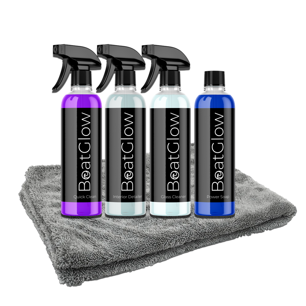 This starter kit gets you everything you need to keep your boat glowing! Includes 16oz bottles of Quick-Clean, Interior Detailer, Glass Cleaner, Power Soap and one of our microfiber wipe down towels. a $100.00 value for just $79.99